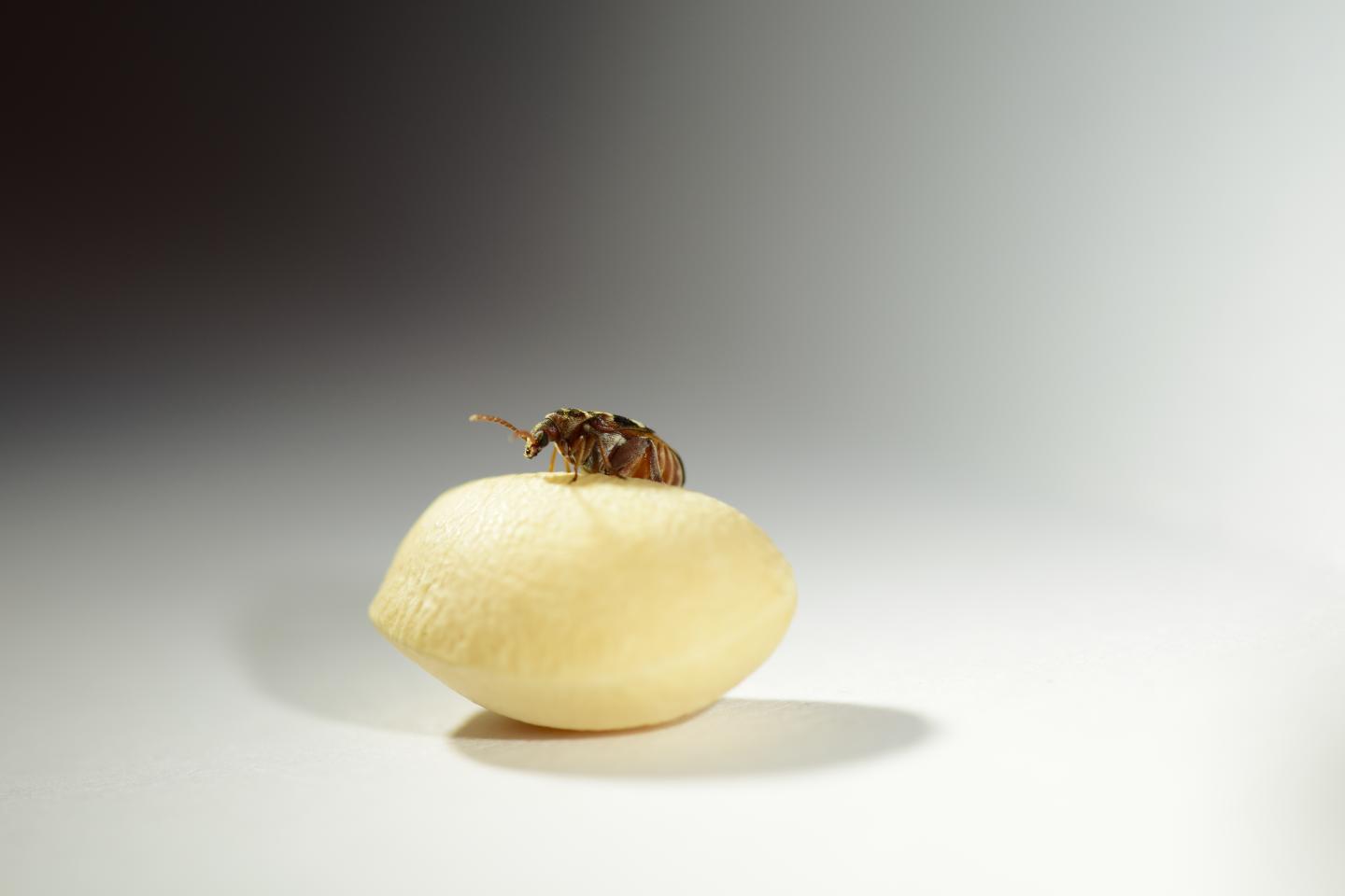 image: One species studied in detail by the researchers is an insect pest known as the cowpea seed beetle (Callosobruchus maculatus). The female pictured is laying eggs on a bean that the larvae then feed on.