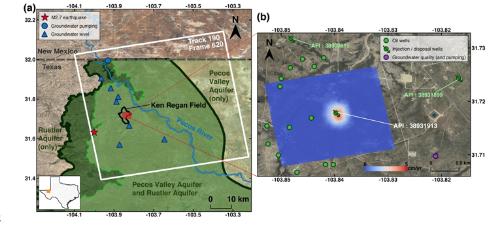 image: a) Coverage of the ALOS PALSAR scenes used (white box). Black line shows the boundary of the Ken Regan field. Dark green line and light green line represent the boundaries of the Rustler Aquifer and Pecos Valley Aquifer in Texas, respectively. Red star represents the epicenter of the earthquake that occurred in May 2018. Blue circle represents the groundwater well for livestock drawing from the Rustler Aquifer in this area. Blue triangles are wells, which provide groundwater leveling records. (b) Vertical deformation (cm/yr) (in the red box in Fig. 1a) estimated from InSAR. Green circles with and without arrows indicate active injection/disposal wells in the Ken Regan field and oil production wells within 1.5 km from the deformation center during the research period, respectively. Purple circle represents the groundwater which provides groundwater quality records.