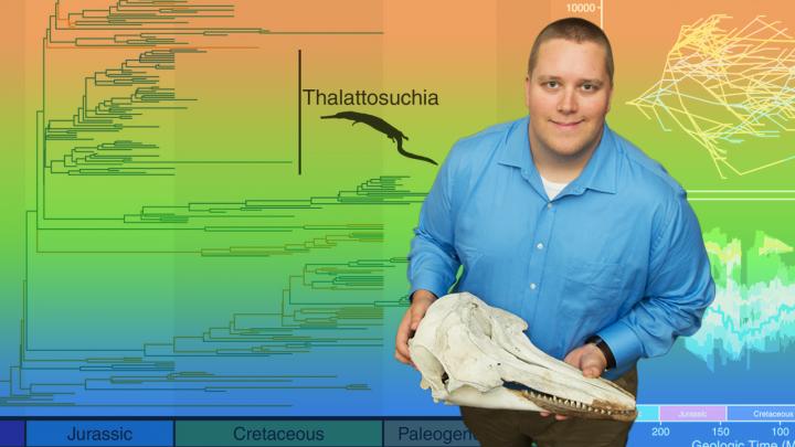 image: Nebraska's Will Gearty holds the skull of a porpoise, whose torpedo-like body resembles those of ancient crocodiles that spent their entire lives in the water. Gearty's research suggests that fully aquatic species got larger not because water released them from the constraints of land -- as longstanding theories have proposed -- but instead to insulate themselves against water's lower temperatures and its capacity to steal body heat.