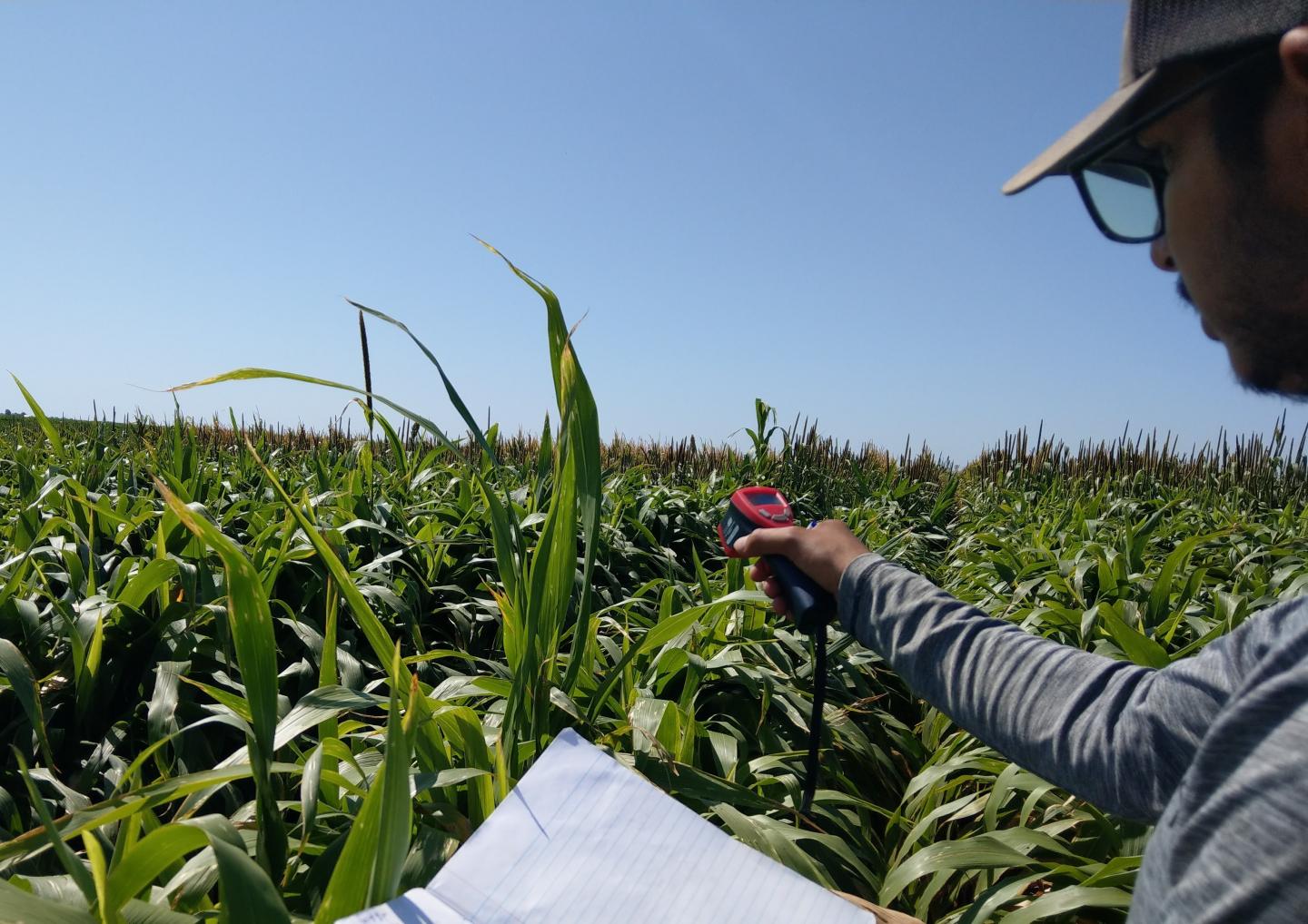 image: Bishwoyog Bhattarai, a graduate student in Sukhbir Singh's lab at Texas Tech University, measuring the canopy temperature using the infrared thermometer.
