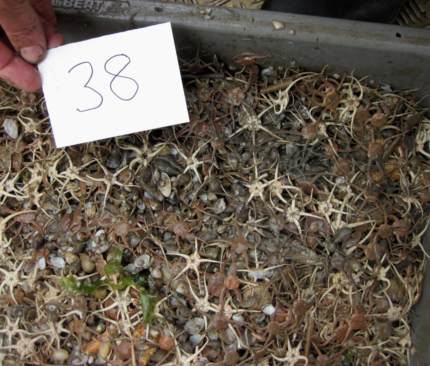 image: This box - number 38 - included brittle stars, bivalves, a starfish and sea urchins.