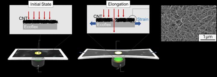 image: Schematic diagram of the sensor based on the optical transmittance changes of the CNT-embedded Ecoflex thin film.