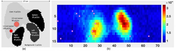 image: a) Maximum intensity projection showing relative positions of organs and tumors in the simulations with sample activity levels. b) Plot of counts for 2D detector array. Red boxes represent detector positions that the algorithm selected for optimal dose estimation. The vest spans about 18 c.m. of the torso.