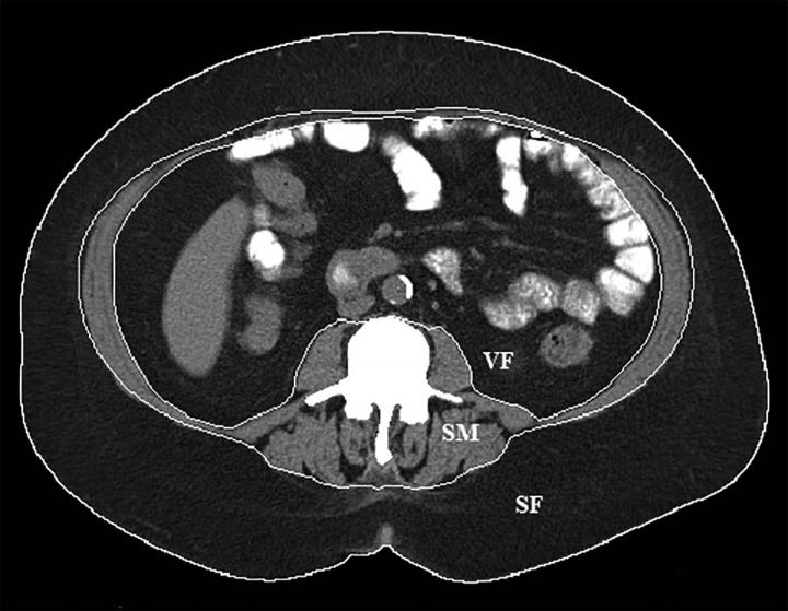 image: Body composition segmentation at the L3 lumbar vertebral body level. Boundaries for subcutaneous fat (SF), visceral fat (VF) and skeletal muscle (SM) are delineated by the white lines.
