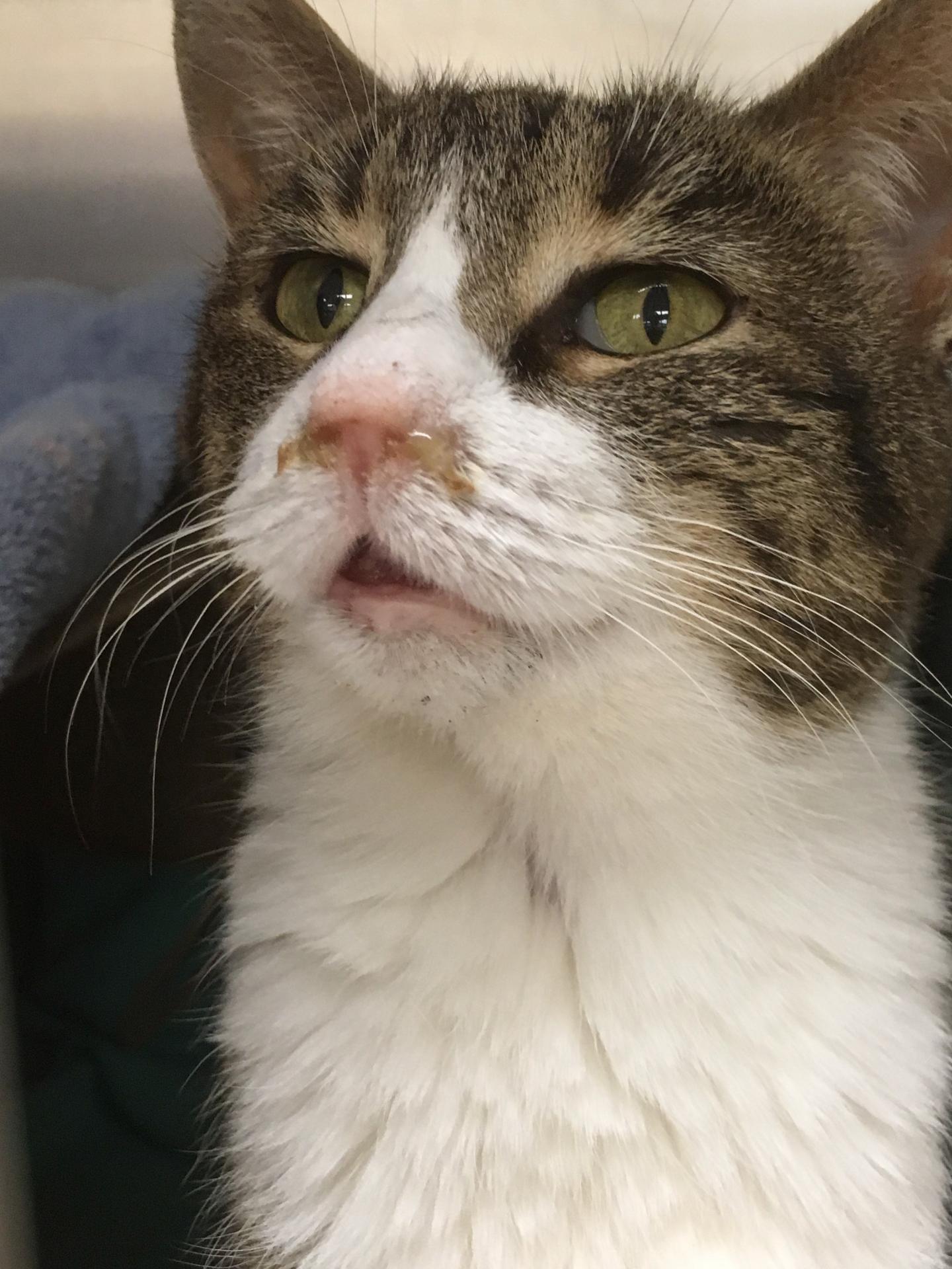 image: The risk of chronic upper respiratory infection appears to be significantly greater for cats in institutional hoarding settings, as shown by this individual rescued by the Toronto Humane Society.