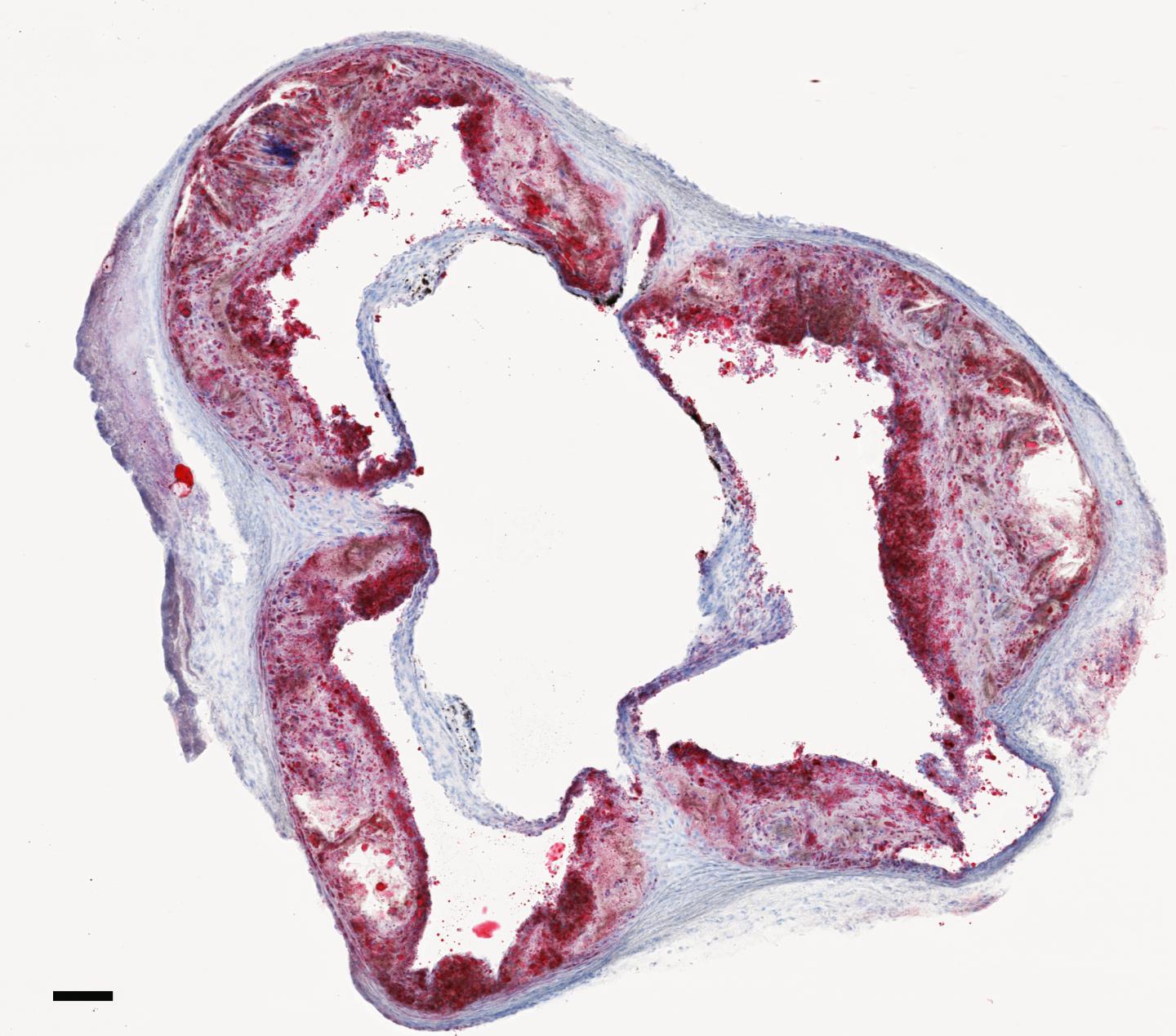 image: This is a cross section of an aorta from a mouse that was fed a high-fat, high-cholesterol diet, which accelerates the build-up of plaque. The large red plaque on the inside of the aorta was labeled with oil based stain, which highlights lipids.