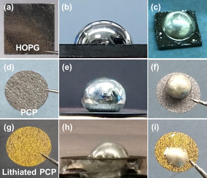 image: Contact angle experiments of Li metal and graphite materials: (a-c) highly oriented pyrolytic graphite (HOPG); (d-f) porous carbon paper (PCP); (g-i) lithiated porous carbon paper (lithiated PCP).