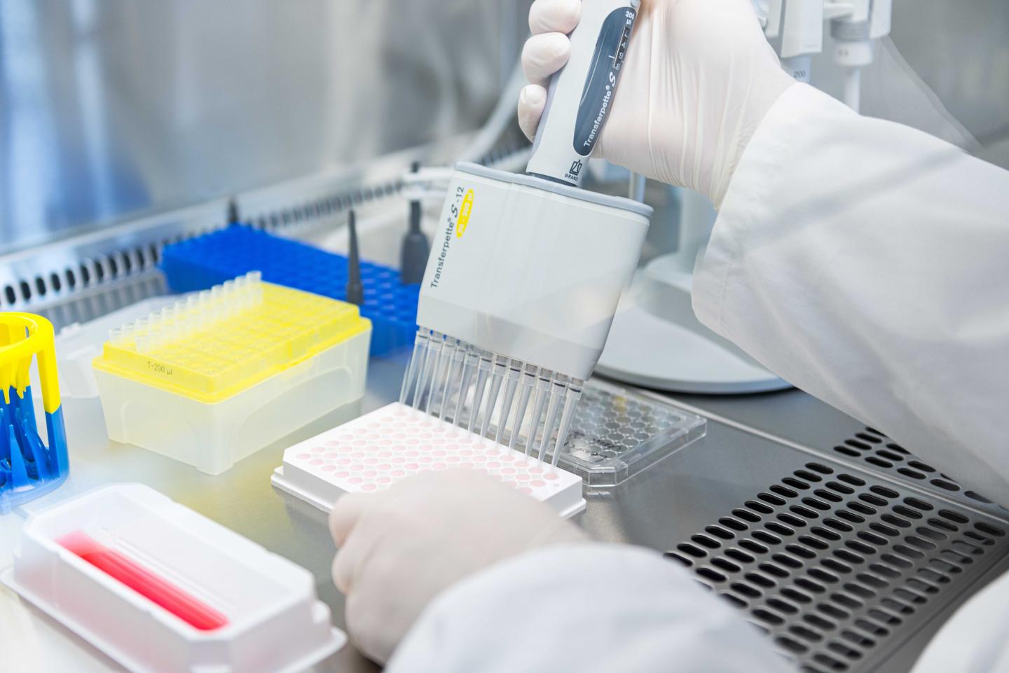 image: Work under sterile conditions. Scientist fills a 96-well plate with cell culture medium.