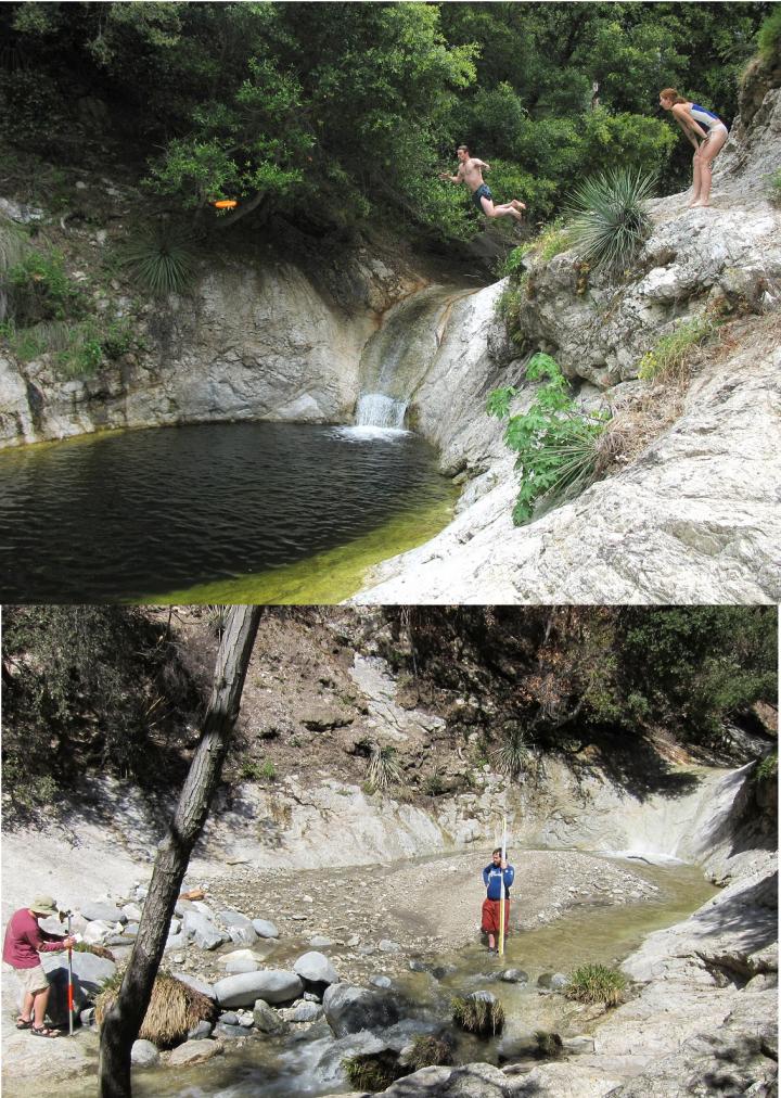 image: : Example of sediment filling and evacuation of sediment in a small waterfall plunge pool on Arroyo Seco, San Gabriel Mountains, California. Top: Plunge pool, free of sediment, in June 2006 with swimmer leaping. Bottom: The same plunge pool filled with sediment in March 2010 following a wildfire in 2009 that overwhelmed the pool with sediment.