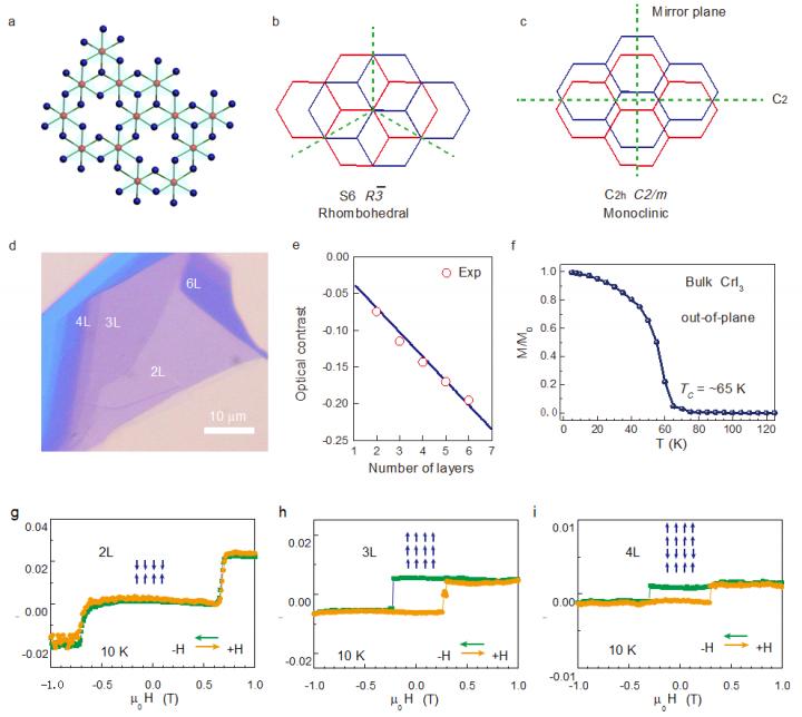 image: Exfoliated few-layer CrI3. (a) Atomic structures of monolayer CrI3. (b, c) Rhombohedral (b) and monoclinic (c) stacking order in bilayer CrI3. The rhombohedral structure has an out-of-plane C3 axis and a symmetric center (s6=c3+i ), while the monoclinic structure has an in-plane C2 axis and a mirror plane. (d) Optical micrograph of the exfoliated few-layer CrI3. (e) Optical contrast of the CrI3 samples with different numbers of layers (red circles). The blue solid line is calculated results based on Fresnel's equations from Xu et al. (Nature, 2017, 546, 270). (f) Magnetization of bulk CrI3 as a function of temperature, indicating that Tc = ~65 K. Layer-dependent magnetic ordering in atomically-thin CrI3 at 10 K. RMCD signal on a 2L (g), 3L (h) and 4L (i) CrI3 flake, showing antiferromagnetic behavior in bilayer CrI3 and ferromagnetic behavior in 3L and 4L CrI3. The blue arrows indicate the magnetization orientation in different layer.