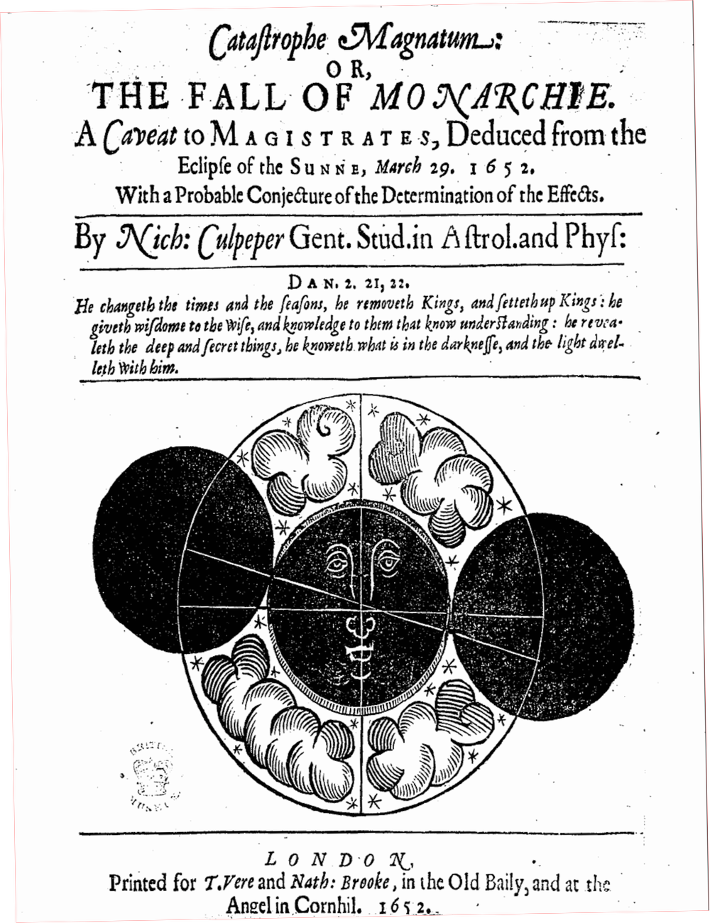 Nicholas Culpeper’s Catastrophe Magnatum, an astrological pamphlet written in 1652 about the so-called ‘Black Monday’ solar eclipse that year. Nicholas Culpeper / Catastrophe Magnatum (1652)