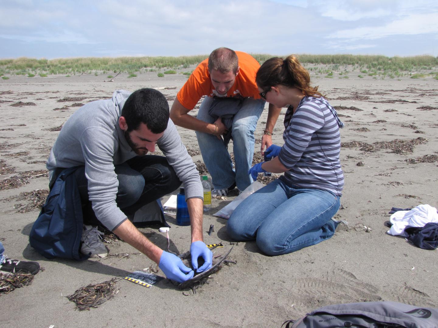 image: Coastal Observation and Seabird Survey (COASST) volunteers tag a sooty shearwater on the coast of Washington state.