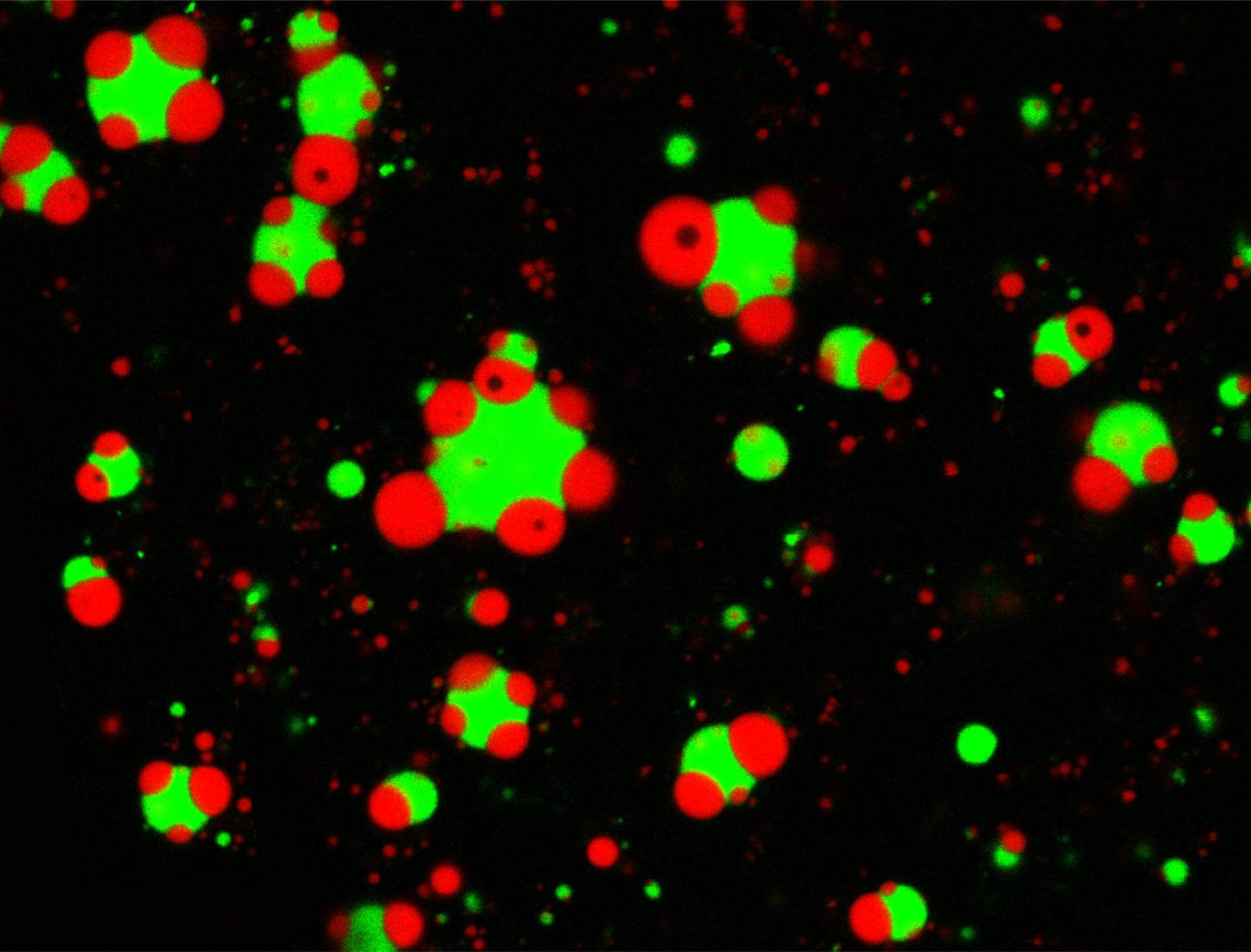 image: A fluorescence microscopy image shows two types of immiscible biomolecular condensates (green and red) sticking to one another. A new study outlines physical rules regulating how such condensates, made from RNA and proteins, form and interact with one another.