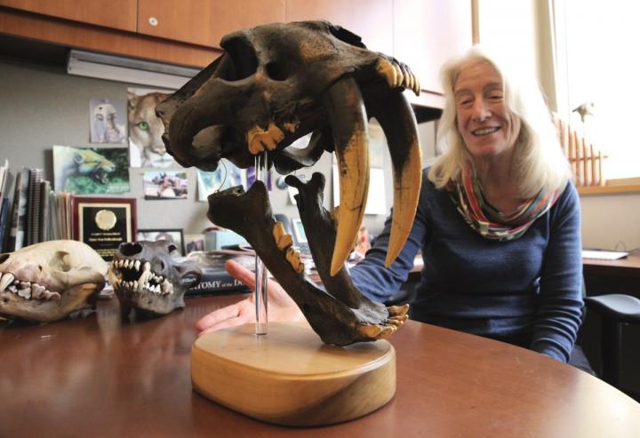 image: Biologist Blaire Van Valkenburgh has spent more than three decades studying the skulls of large carnivores. Here she displays a replica of a saber-toothed cat skull. At left are the skulls of a spotted hyena (in white) and a dire wolf (the black skull).