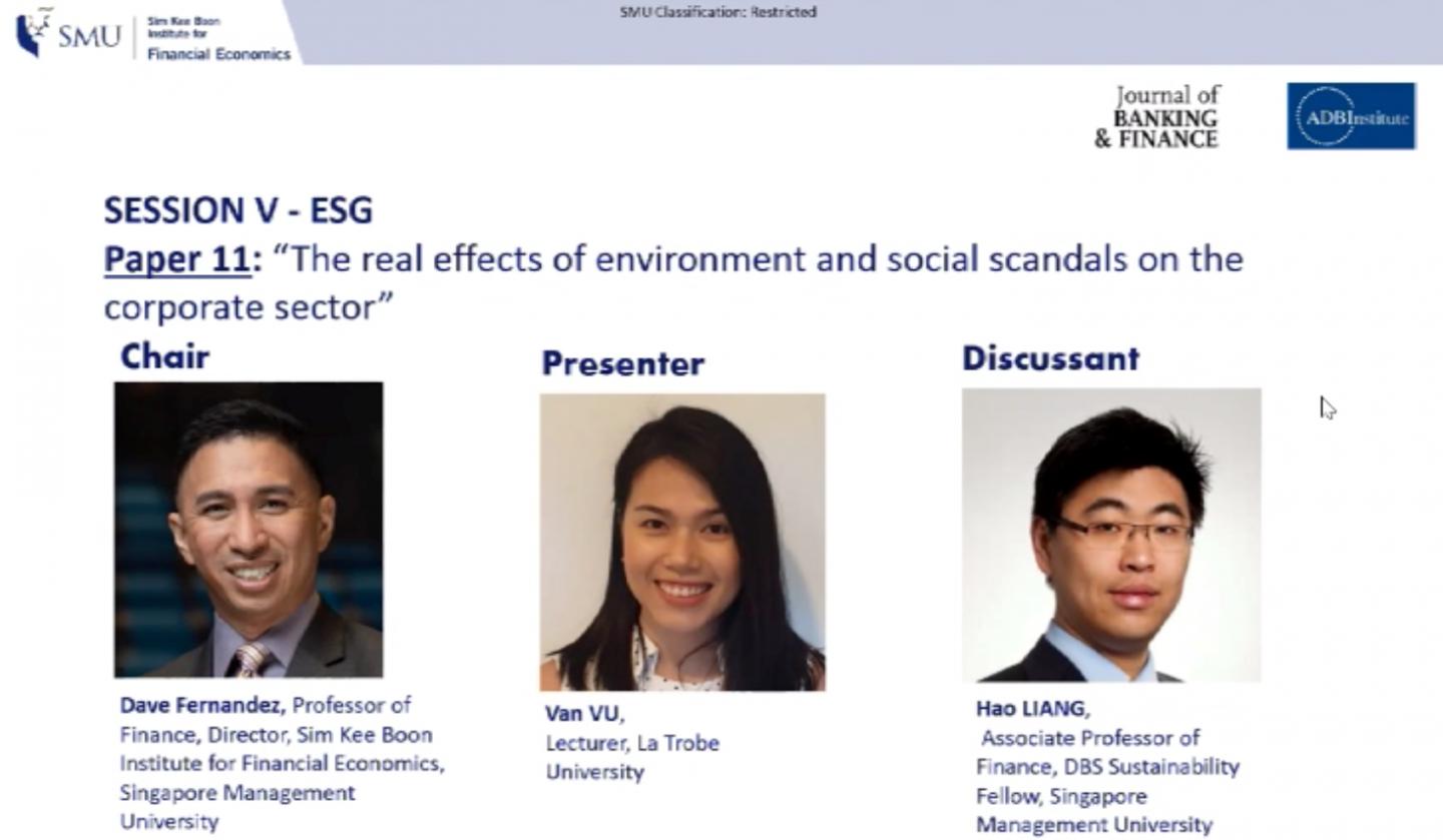 As part of the Conference on Green and Ethical Finance held from 16 to 18 September 2020, their findings were tackled in the environmental, social and governance (ESG) session chaired by Professor Dave Fernandez, Director of Singapore Management University's (SMU) Sim Kee Boon Institute for Financial Economics (SKBI). The virtual conference was jointly organised by SKBI, Asian Development Bank Institute and the Journal of Banking and Finance.