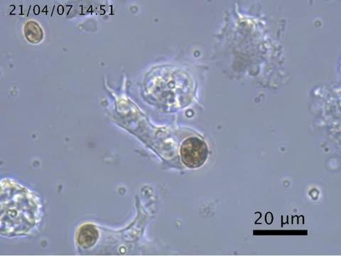 video: First stage in the formation of the mutualism ("symbiosis") between cells of the coral Acropora tenuis (Cnidaria: Acroporidae) [transparent] and free-living algae of its potential "zooxanthella" partner, the single-celled photosynthetic dinoflagellate Breviolum minutum (Alveolata: Symbiodiniaceae) [brown-green]. When the mobile A. tenuis cells encounter a free B. minutum, they engulf it with their pseudopodia.
