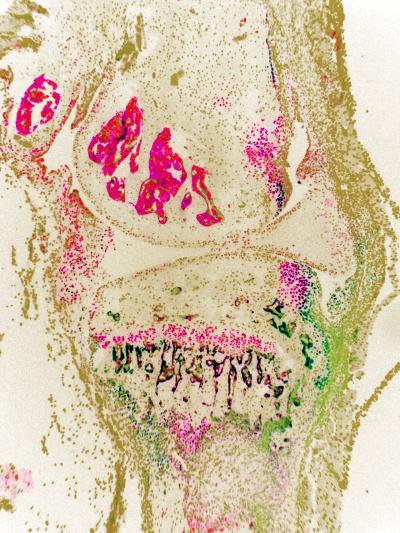 Led by Crump and de Bari, an international team of scientists made this discovery by studying mice that had sustained a type of knee injury that causes arthritis. In these mice, a different colored fluorescent protein labeled each of eight distinct cell populations. This allowed the scientists to view the fluorescent labels under a microscope and trace how the various cell populations contribute to the formation of arthritic bone spurs.