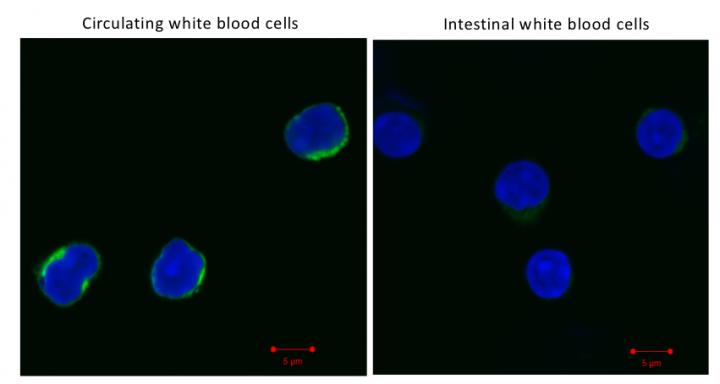 image: In circulating white blood cells (left side) the "batteries" or mitochondria (in green) have a stronger signal -- than in intestinal white blood cells, that are in a 'low energy mode' (right side). Blue indicates the cell's nucleus.