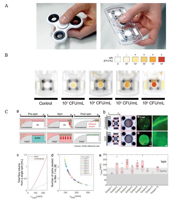 image: (A) Photographs of a fidget spinner toy (left) and a diagnostic-fidget spinner (right). (B) Bacterial load detection by color changes. Orange color shows high bacterial cell load. (C) Fluid Assisted Separation Technology (FAST) enables rapid and robust enrichment of bacteria. (C-a) Cross-sectional view of the device depicting sample bacterial enrichment through the filter membrane in the conventional (upper) and FAST (lower) setups. (C-b) Images showing effective filtration during rotation and fluorescence images of bacterial cells enriched on the membrane for (1 and 3) conventional and (2 and 4) FAST filtration. Scale bar: 2 mm / 0.1 mm. (C-c) Flow volume of Dx-FS estimated at ω_max. (C-d) Number of spins by 10 independent subjects who spun Dx-FS. The angular velocities were measured, and the number of spins to elute 1 mL of liquid was estimated. (C-e) Measurements from (d) plotted for each subject. Red lines, dashed red lines, and gray and red boxes over the measurements (gray dots) denote the mean, median, standard error of mean, and standard deviation. The gray areas indicate the number of spins in (d).