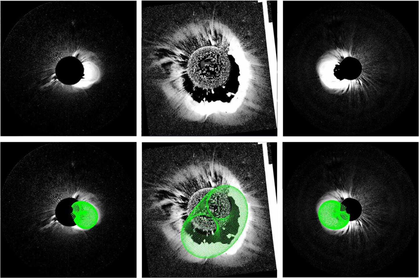 image: (Top panel, from left to right) July 12, 2012 coronal mass ejection seen in STEREO B Cor2, SOHO C2, and STEREO A Cor2 coronagraphs, respectively. (Bottom panel) The same images overlapped with the model results.