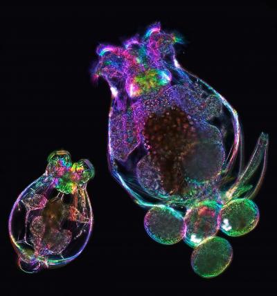 image: Mother rotifer (Brachionus manjavacas) carrying four eggs (right) and newly-hatched daughter (left). Image of live rotifers acquired using polychromatic polarization and phase contrast.