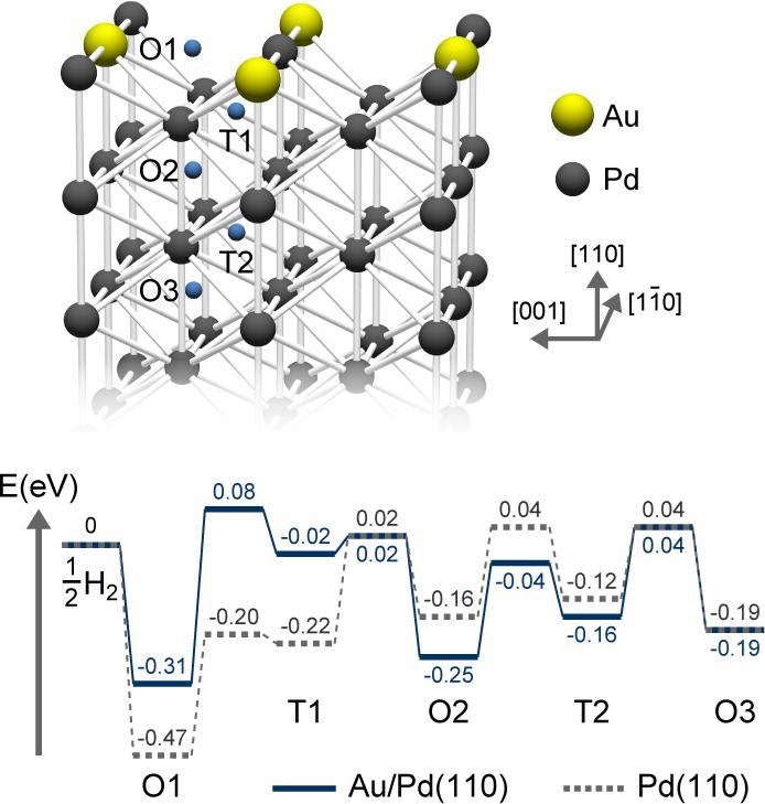 According to density functional theory (DFT) calculations, the Au atoms destabilize chemisorbed hydrogen, thus increasing their energy and reducing the barrier. By making the surface a less stable environment for H atoms, this encourages them to penetrate more quickly into deeper sites, instead of lingering at the surface. Photoemission spectroscopy suggests that Au atoms push the energy of the Pd electrons downward, weakening their ability to chemisorb hydrogen.