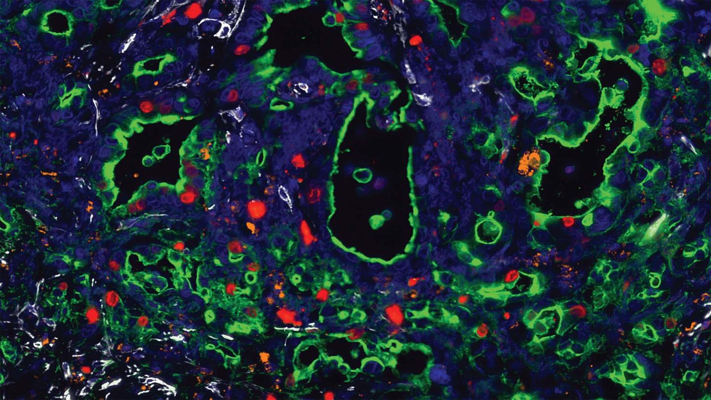 image:Â Photomicrograph of a human pancreatic cancer tumor showing a mixture of different kinds of cells in close proximity to each other. Tumor-promoting, p63-positive cancer cells are stained red, neutrophils orange, fibroblasts white, and other p63-negative cancer cells are green. Given that p63-positive pancreatic cancer cells secrete inflammatory factors, this image demonstrates how these cancer cells can communicate with surrounding cells and promote inflammatory processes in human patients. The sample was stained by multiplexed immunofluorescence.