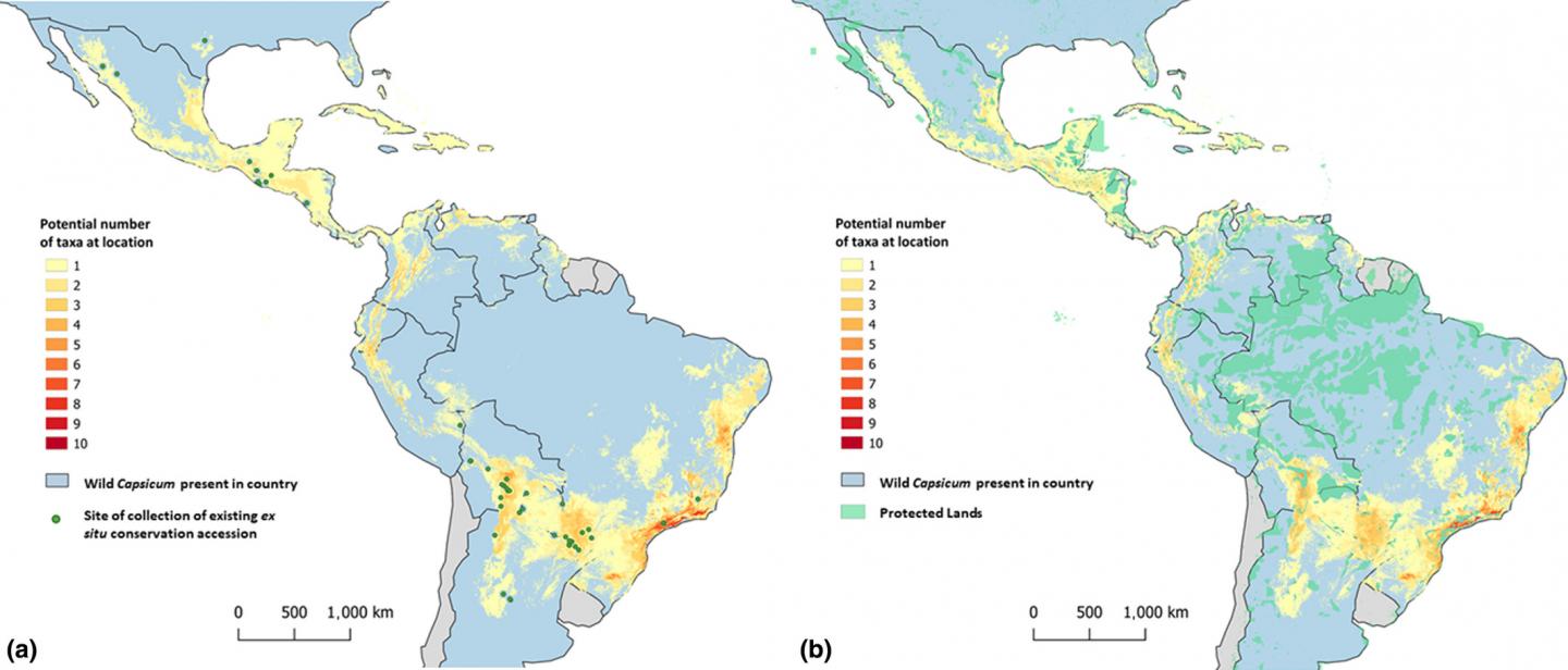 image: These maps show the distribution of wild chile pepper taxa across the Americas. Green dots on the left map shows where wild species have been collected and stored in gene banks. The map on the right shows where species occur in comparison to protected areas.