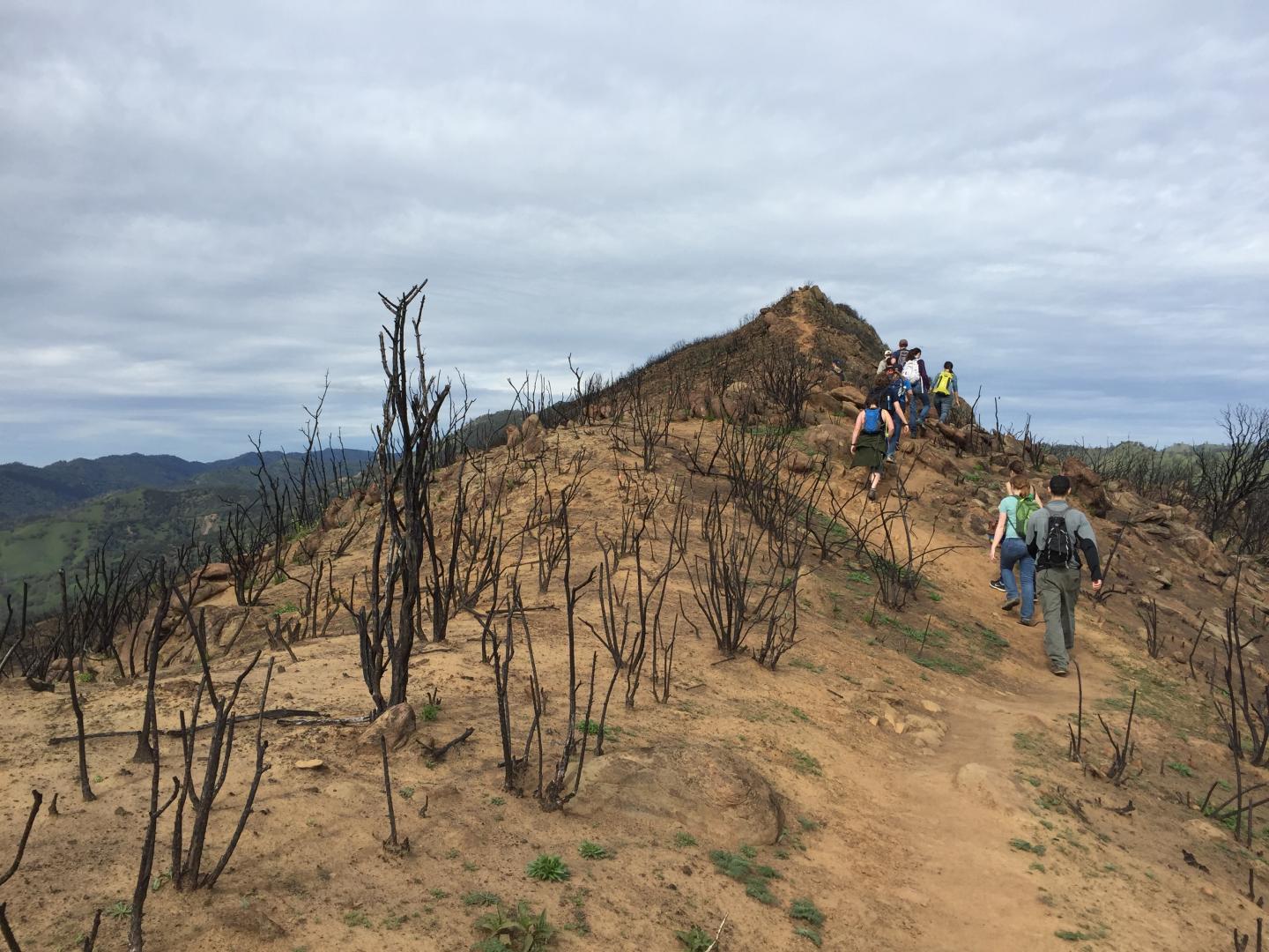 image: Students in a UC Davis fire ecology class walk along a burned ridge top of Stebbins Cold Canyon Natural Reserve in 2016.