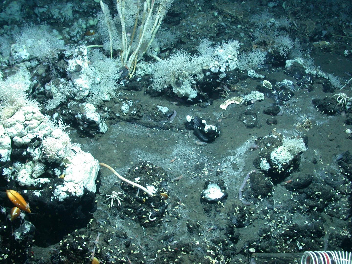 image: Hydrocarbon seep in the southern Gulf of Mexico emitting a viscous petroleum, much like asphalt. Hydrocarbons serve as an energy source for microbes and in turn, microbial biomass is a food source for a diverse community of organisms including tube worms, mussels, crabs and shrimp.