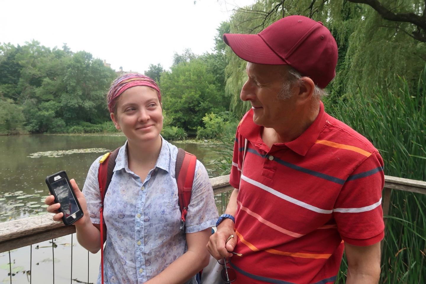 image: Boston University biologists Richard Primack and Carina Terry are pictured here collecting noise samples at Hall's Pond Sanctuary in Brookline, Massachusetts.