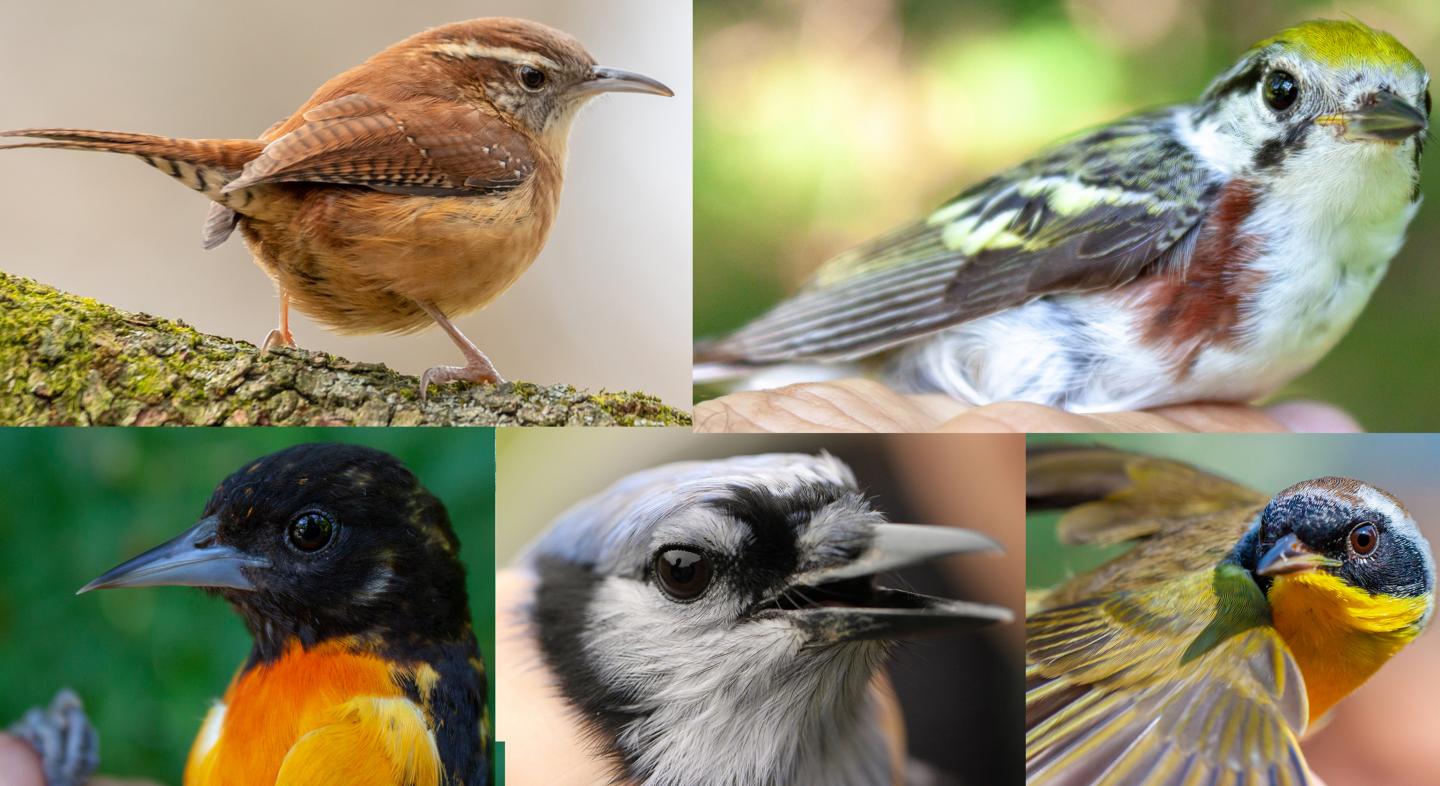 image: Some of the birds that were captured and banded in the research included, top row, from left, Carolina wren and chestnut-sided warbler and, bottom row from left, Baltimore oriole, bluejay and common yellowthroat