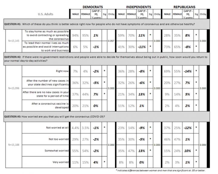For example, if there were no government restrictions on being out in public, 69 percent of Republican men would resume regular activities immediately, versus 55 percent of Republican women (the same is true for 36 percent of independent men and 28 percent of independent women, and 7 percent of Democratic men versus 4 percent of Democratic women). Similarly, 37 percent of Republican men reported being "not worried at all" about contracting the coronavirus, versus just 25 percent of Republican women, with significant differences observed for independents and Democrats, as well. (See Table at the end of this release).