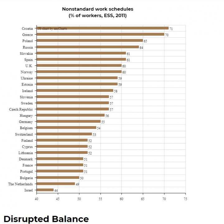 Conducted in 27 countries, the ESS found that countries with the highest rates of nonstandard working hours included Croatia (71%), Greece (70%) and Poland (65%), while those where nonstandard schedules were less common included Denmark, France and Portugal (51% each), Bulgaria (50%), the Netherlands (49%), and Israel (44%).
