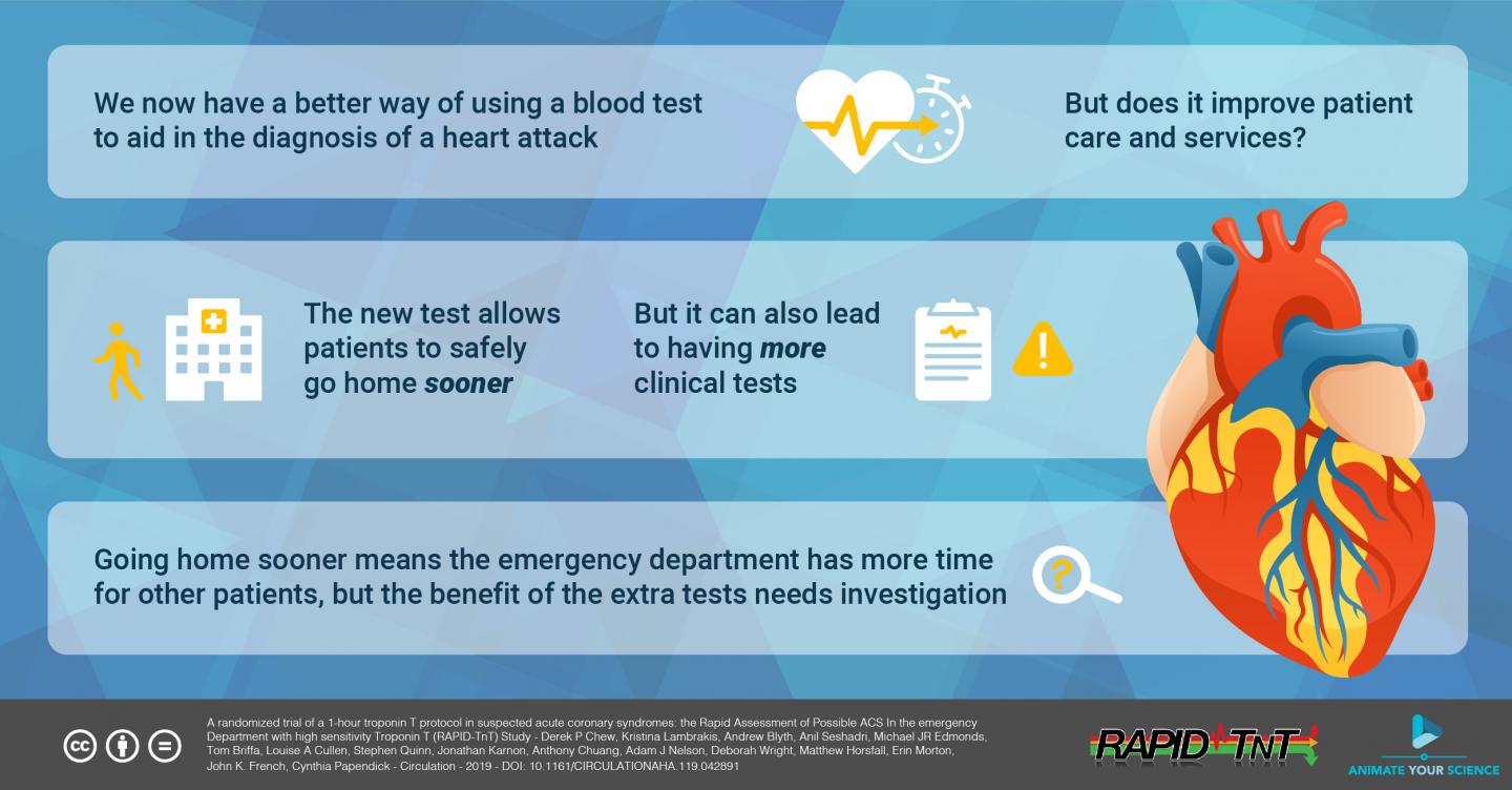 The world-first 'RAPID-TnT' trial focuses on a more sensitive cardiac blood test for a protein called Troponin T, paired with a faster testing protocol.