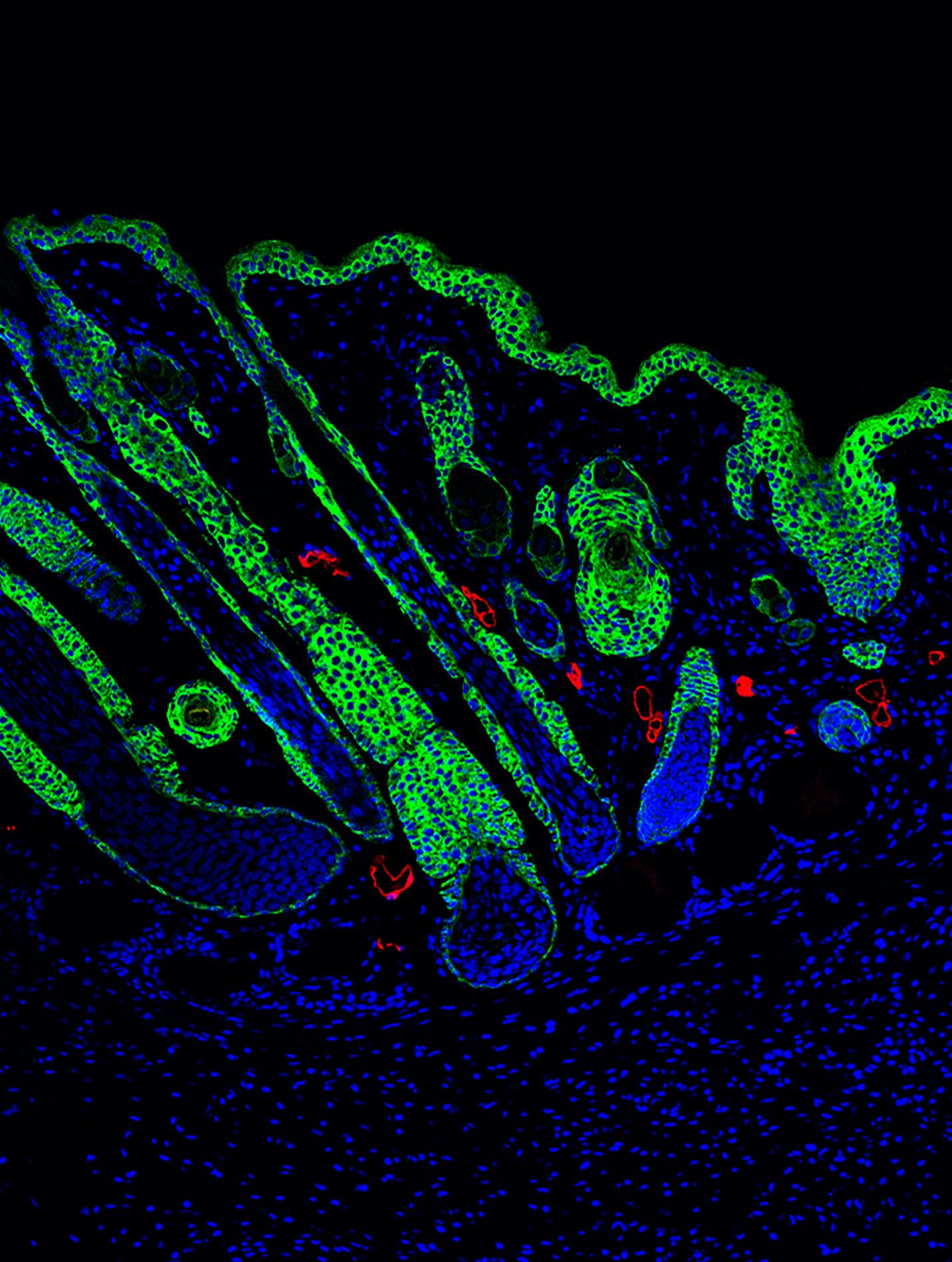 image: The image shows regenerated hair follicles at the center of a wound. The hair follicles appear as tear drop structures, and they have Keratin 5 positive tips, which appear in green.