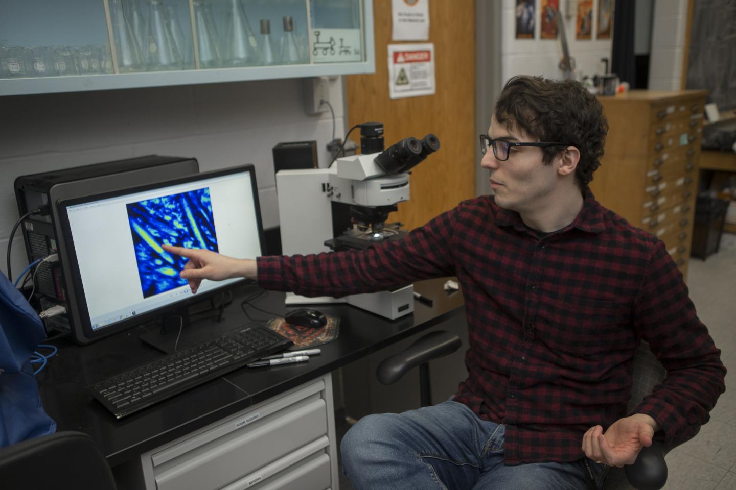 In UC professor Czaja's geology lab, Gangidine peers through a microscope at slides he prepared from chunks of Yellowstone silica he took from a mountainous steam cone geyser.