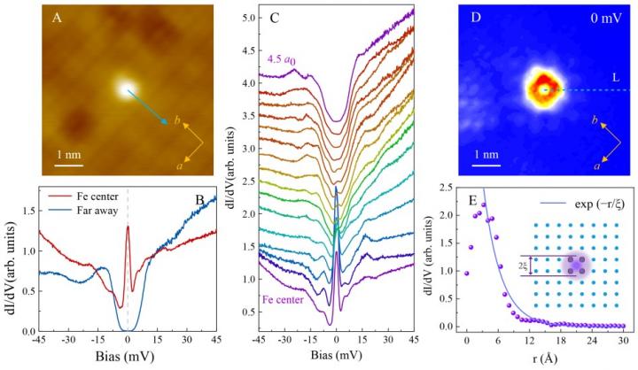 image: Figure 1. A,B, Isolated Fe adatom and the tunneling spectra on single-layer FeSe. C, Tunneling spectra collected along the arrow in A. D, Zero-bias conductance imaging for the adatom in A. E, Exponential fit to the linecut L in D.