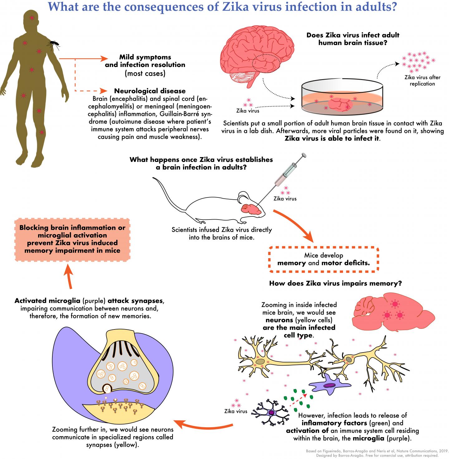 The work further showed that infection by ZIKV causes a strong inflammatory response in the mouse brain, and this includes activation of brain resident immune cells called microglia. Fernanda Barros-Aragão, a PhD student and author of the study, explains that this exaggerated inflammatory response is ultimately responsible for memory loss: "Neurons communicate through highly specialized regions called synapses. Surprisingly, we found that microglia that become aberrantly activated upon infection by ZIKV attack and engulf synapses. This impairs communication between neurons and, therefore, the formation of new memories." Interestingly, when animals were treated for about one week with anti-inflammatory drugs capable of blocking microglial activation, they recovered memory.