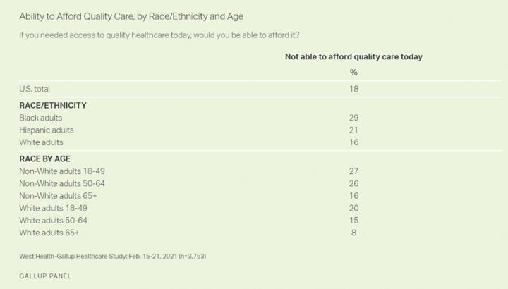 image: Breakdown of respondents ability to afford quality healthcare by race/ethnicity and age.