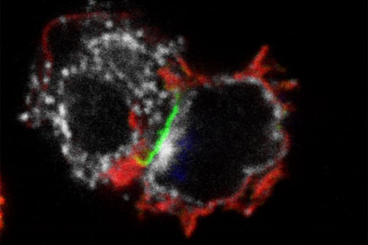 image: Researchers at Washington University School of Medicine in St. Louis have combined two types of immunotherapy into a single treatment that may be more effective and possibly safer than current immunotherapies for blood cancers. Shown is a type of immune cell called a memory-like natural killer cell (right) attacking a leukemia cell (left). In the new study, the researchers modified the natural killer cells to help them find the leukemia cells more effectively.