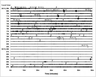 24 hours of data from a seismic station in Mudanjiang, China, on the date of one purported 2010 North Korean nuclear test. Background levels are higher during working hours than at night, suggesting human causes such as traffic, electric motors and passing trains -- but there is no indication of a nuclear explosion, say the authors of a new paper. Each line represents one hour, sampled 40 times per second.