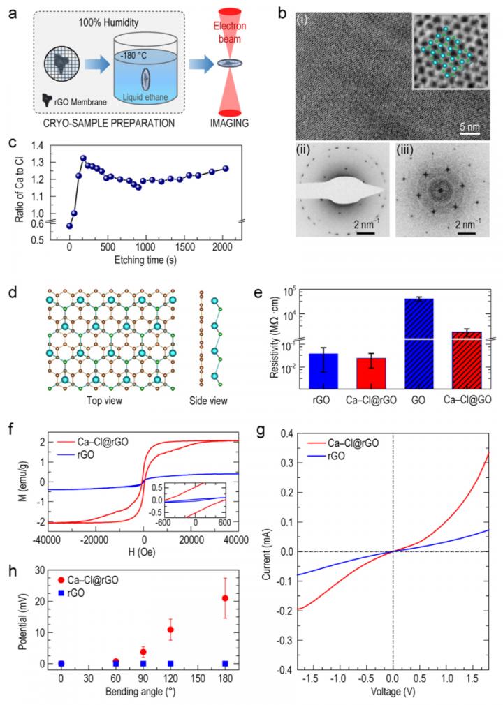 image: (a) Schematic drawings of the sample preparation processes. (b) (i) Cryo-EM image of the Ca-Cl crystals in the ultra-thin reduced graphene oxide (rGO) membrane. (ii) Diffraction pattern of a typical crystal structure by cryo-EM in electron diffraction mode. (iii) Fourier transform of the entire bright-field image showing the same hexagonal lattice as in (ii). (c) Atomic ratio of Ca to Cl as a function of the etching time measured by XPS during etching by argon ion for a sample of the dried Ca-Cl@rGO membrane. (d) One stable structure from the molecular model I of CaCl crystal modules adsorbed on graphene sheet from theoretical computations. (e) Electrical resistivity measured by using the multimeter with two electrodes connecting with the up and down surfaces of the dried rGO and GO membranes, respectively. (f) Room-temperature ferromagnetism of the dried Ca-Cl@rGO membrane. (g) Heterojunction behavior of the dried Ca-Cl@rGO membrane. (h) Piezoelectricity-like property of the dried Ca-Cl@rGO membrane under ambient conditions.