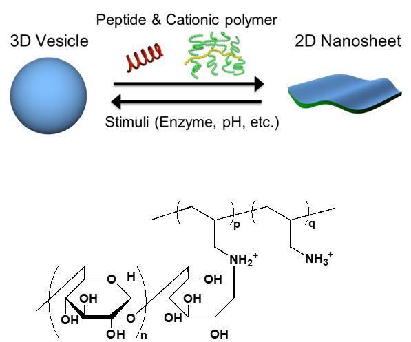 image: 3D vesicles can be reversibly converted to 2D nanosheets via the cooperative action of a peptide and a cationic polymer called PAA-g-Dex, whose chemical structure is shown.