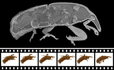 How does the hip joint of a crawling weevil move? A technique to record 3D X-ray films showing the internal movement dynamics in a spatially precise manner and, at the same time, in the temporal dimension has now been developed by researchers at ANKA, KIT's Synchrotron Radiation Source. The scientists applied this technique to a living weevil. From up to 100,000 two-dimensional radiographs per second, they generated complete 3D film sequences in real time or slow motion. The results are now published in the Proceedings of the National Academy of Sciences (PNAS) DOI: 10.1073/pnas.1308650111.