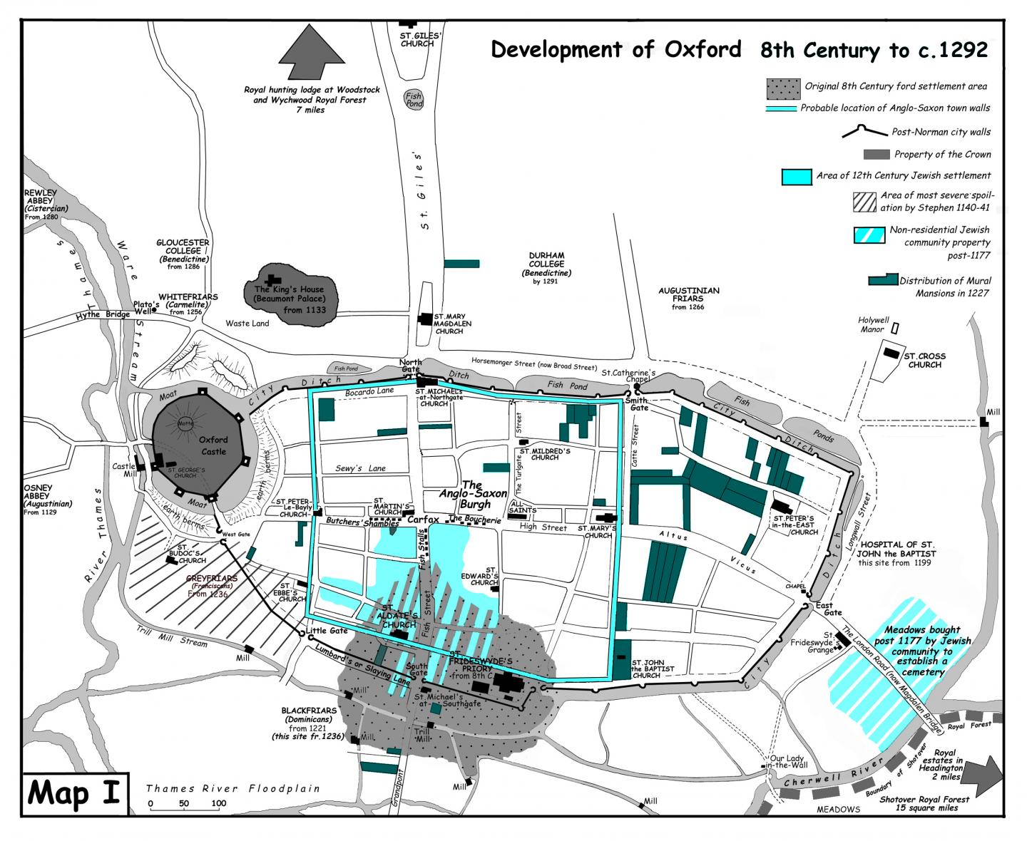 image: Map showing the development of the City of Oxford from the 8th Century to c. 1292, with the Jewish quarter shown in blue
