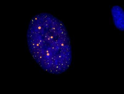 About 10 percent of tumor cells use a mechanism called ALT, short for alternative lengthening of telomeres, to keep their chromosomes ends intact. PML bodies that contain telomeric DNA and associated telomere-binding proteins (shown in orange) are highly characteristic of ALT tumor cells.