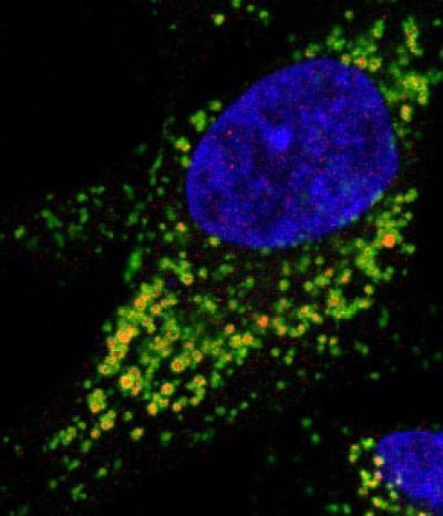 This is a cell with lysosomes (green) with accumulated amyloid-beta (red).