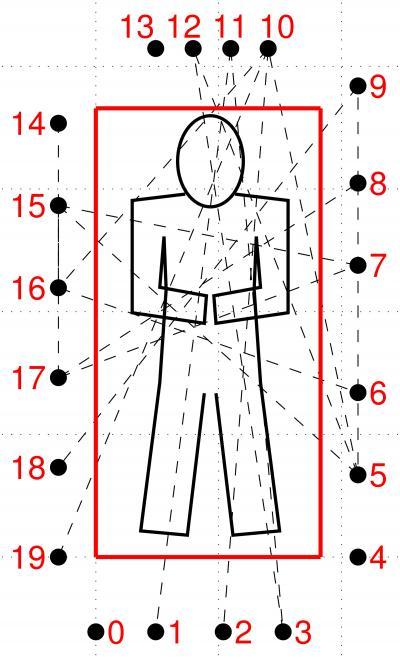 This diagram shows how a network of 20 wireless transceivers send radio waves crisscrossing a person on a bed. The transceivers or "nodes" connected by dashed lines indicate radio signal links that detected breathing. University of Utah engineers are developing wireless networks as a new kind of breathing monitor named BreathTaking, and hope it can be used to allow more comfortable monitoring of breathing by people who have undergone surgery, adults with sleep apnea and perhaps babies at risk of sudden infant death syndrome.