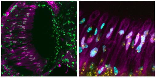 image: These images show glial cells of the optic chiasm in the adult fly brain that have accumulated extra genome copies. Both images show the same cells, but the second (right) is a higher-magnification image. The first (left) shows the glial cell marker, stained with an antibody, in green, while the second shows the glial cell marker in cyan and the cell nucleus in yellow.